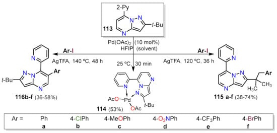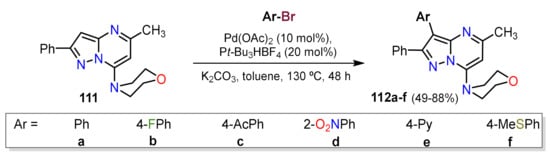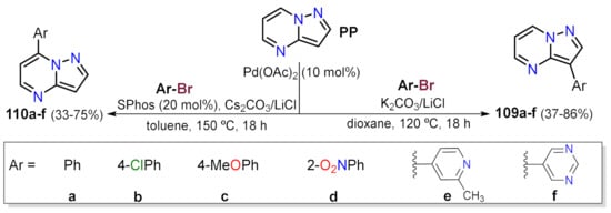 - Bedford, R.B.; Durrant, S.J.; Montgomery, M. Catalyst-Switchable Regiocontrol in the Direct Arylation of Remote C-H Groups in Pyrazolo[1,5-a]pyrimidines. Angew. Chemie Int. Ed. 2015, 54, 8787–8790. [Google Scholar] [CrossRef] [PubMed]