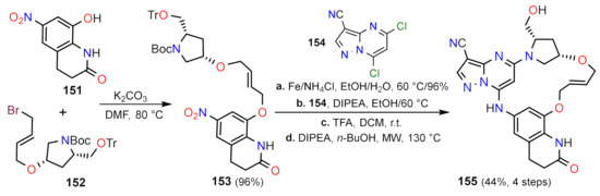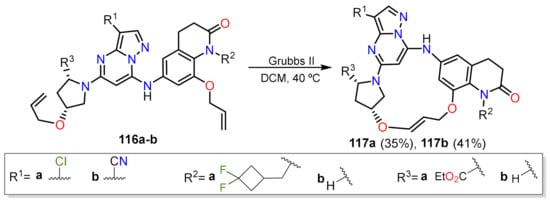 - Attia, M.H.; Elrazaz, E.Z.; El-Emam, S.Z.; Taher, A.T.; Abdel-Aziz, H.A.; Abouzid, K.A.M. Synthesis and in-vitro anti-proliferative evaluation of some pyrazolo[1,5-a]pyrimidines as novel larotrectinib analogs. Bioorg. Chem. 2020, 94, 103458. [Google Scholar] [CrossRef] [PubMed]