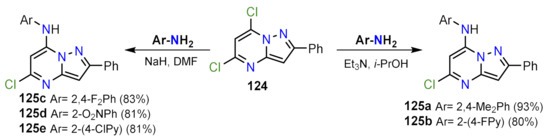 - Loubidi, M.; Manga, C.; Tber, Z.; Bassoude, I.; Essassi, E.M.; Berteina-Raboin, S. One-Pot SNAr/Direct Pd-Catalyzed CH Arylation Functionalization of Pyrazolo[1,5-a]pyrimidine at the C3 and C7 Positions. Eur. J. Org. Chem. 2018, 2018, 3936–3942. [Google Scholar] [CrossRef]
