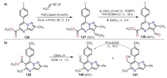 Comparatively, Schmitt and co-workers established a methodology that allows the functionalization with aryl or heteroaryl groups at position 7 (compounds 39a–f) employing substituted alkynes 38a–f (Scheme 12a). In addition, they took advantage of substituted pyrazoles to functionalize positions 2 and 3 (not shown) [50]. Recently, Akrami and co-workers developed a protocol capable of reduces reaction time employing dimethyl acetylenedicarboxylate (38g) and the aminopyrazole 21b (Scheme 12b) [51]. The reaction was optimized in terms of solvent, temperature, and time, obtaining an ester group at position 7 of the respective product 39g.