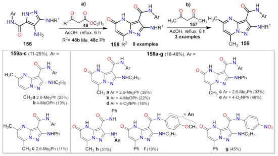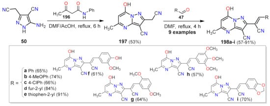 Examples of multicomponent synthesis of pyrazolo[1,5-a]pyrimidines (a) 49 and (b) 51a–f.