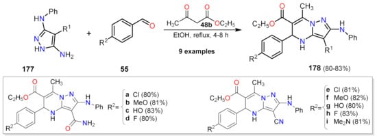 Notably, the synthetic protocol of compound 49 is suitable for preparative quantities in conditions that are easily reproducible in the laboratory. Similarly, Shastri et al. developed a method focused on obtaining derivatives from different arylaldehydes 47a–f. In contrast to the previous example, the synthesis of products 51a–f contemplates mixing all the starting materials in the same vial (Scheme 16b) [56]. In this case, the more extended reaction periods could improve the yields, although aminopyrazole’s stereoelectronic properties could improve selectivity, avoiding side reactions like dimerization or aromatic substitutions. Besides, oxidation step relevance could be evaluated from work reported by Ismail, where a similar approach led to products in good yields, but the lack of an oxidation step produces PP dihydroderivatives (see Section 3.1 for detail) [57].