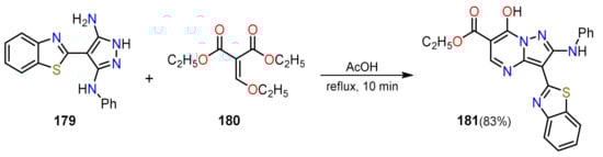 - Abu Elmaati, T.M.; El-Taweel, F.M. New Trends in the Chemistry of 5-Aminopyrazoles. J. Heterocycl. Chem. 2004, 41, 109–134. [Google Scholar] [CrossRef]