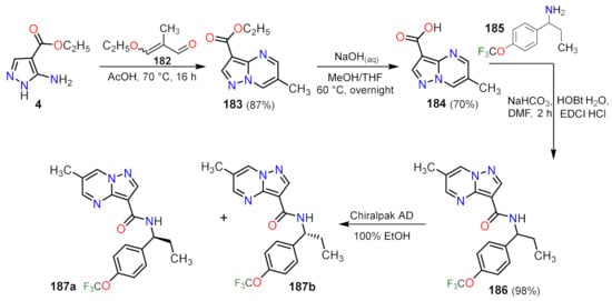 - Al-Azmi, A. Pyrazolo[1,5-a]pyrimidines: A Close Look into their Synthesis and Applications. Curr. Org. Chem. 2019, 23, 721–743. [Google Scholar] [CrossRef]