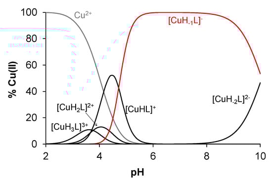 Complexes [CuH3L]3+, [CuH2L]2+, [CuHL]+, [CuH−1L]−, and [CuH−2L]2− were observed with DAHK in the 30% (w/w) DMSO/H2O solvent mixture. On the basis of the overall stability constants, concentration distribution curves were calculated (Figure 1), showing the formation of [CuH3L]3+, [CuH2L]2+, and [CuHL]+ in the acidic pH range, and [CuH−1L]− becomes the predominating species at pH > 5.5, while [CuH−2L]2− forms in the alkaline medium. Due to the close similarity between the complexation scheme of DAHK and Asp-Ala-His-Lys-NH2 [31], the coordination of four nitrogen donors (Asp-N, amide-N of Asp-Ala, amide-N of Ala-His residues, and His-N) can be assumed in the complex [CuH−1L]−. It should be noted that at ligand excess bis complexes are also present. Additionally, the conditional stability constant for the DAHK complex was also calculated at pH 7.4 in 30% (w/w) DMSO/H2O, and the obtained value is logK’7.4 = 14.2, which shows an acceptable agreement with values 13.6 and 13.7 (in pure water) reported for DAHK by isothermal titration calorimetry [32] and for DAHK-NH2 obtained by pH-potentiometry [31], respectively.