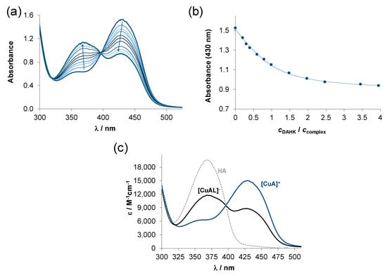 (a) UV–vis spectra recorded for the copper(II)‒Triapine‒DAHK (1:1:x) system at pH 7.4 after 4 h equilibration time (x:0–4). (b) Absorbance values at 430 nm plotted against the ratio of DAHK and the copper(II)-Triapine complex. (c) Molar absorbance spectra of the Triapine complex ([CuA]+), the Triapine-DAHK ternary complex ([CuAL]−), and the unbound Triapine molecule (HA). {cCu(II) = cTriapine = 200 μM, cDAHK = 0–800 μM; 30% (w/w) DMSO/H2O; pH = 7.4 (20 mM HEPES); T = 25 °C; I = 0.10 M (KCl); ℓ = 0.5 cm}.