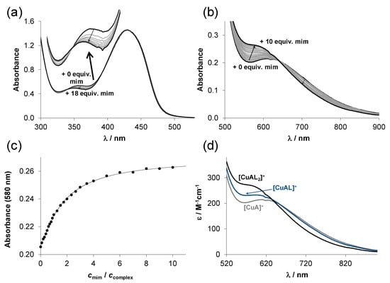 UV–vis spectra recorded for the copper(II)‒Triapine‒N-methylimidazole (mim) system at pH 7.4 after 5 min equilibration time in the wavelength range of the (a) CT bands and the (b) d-d bands at various equivalents of mim. (c) Absorbance values at 580 nm plotted against the ratio of mim and the copper(II)-Triapine complex obtained from the d-d range of the UV–vis spectra. (d) Calculated molar absorbance spectra of the Triapine complex ([CuA]+), the Triapine-mim ternary complexes ([CuAL]+ and [CuAL2]+). {30% (w/w) DMSO/H2O; pH = 7.4 (20 mM HEPES); T = 25 °C; I = 0.10 M (KCl); a: cCu(II) = cTriapine = 102 μM, cmim = 0–1.80 mM; ℓ = 1 cm; b: cCu(II) = cTriapine = 250 μM, cmim = 0–2.50 mM; ℓ = 4 cm}.