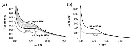 (a) Visible spectra recorded for the copper(II)‒STSC‒HSA system at pH 7.4 after 4 h equilibration time in the wavelength range of the d-d bands at various equivalents of HSA and (b) the calculated molar absorbance spectra of the binary STSC [CuA], and the ternary [CuA(HSA)] complex. {30% (w/w) DMSO/H2O; pH = 7.4 (20 mM HEPES); T = 25 °C; I = 0.10 M (KCl); cCu(II) = cTSC = 200 μM, cHSA = 0–600 μM; ℓ = 5 cm}.