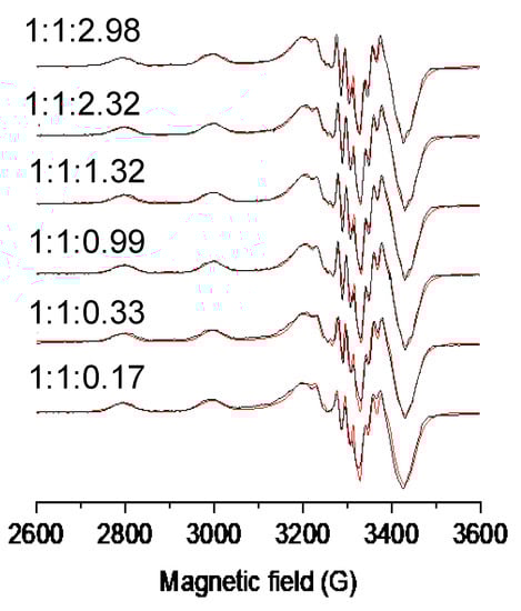 Experimental (black) and simulated (red) anisotropic EPR spectra recorded for the copper(II)‒STSC‒HSA system at pH 7.4 after 4 h equilibration time at 77 K. Numbers above the spectra indicate the copper(II):STSC:HSA ratios. {cCu(II) = cSTSC = 202 μM, cHSA = 0–600 μM; 30% (w/w) DMSO/H2O; pH = 7.4 (20 mM HEPES); I = 0.10 M (KCl)}.