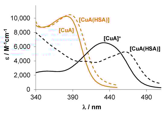 Calculated molar absorbance UV–vis spectra of the binary copper(II)-TSC ([CuA]) and the copper(II)-TSC-HSA ([CuA(HSA)]) ternary complexes in the wavelength range of the CT bands. (Triapine: black lines, STSC: orange lines). {30% (w/w) DMSO/H2O; pH = 7.4 (20 mM HEPES); T = 25 °C; I = 0.10 M (KCl); ℓ = 5 cm}.