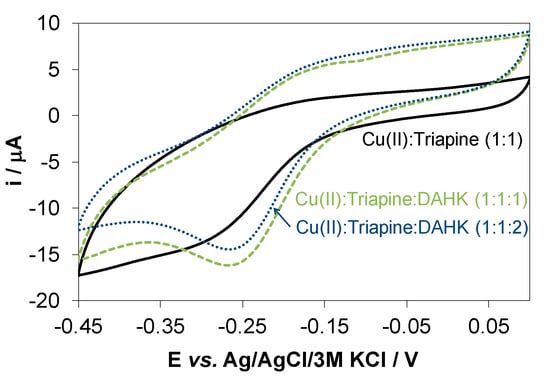 Since the anticancer activity of the copper(II)-TSC complexes is often related to their redox properties [7,10,29,34], we also investigated whether these features are affected by the binding of HSA (or the model DAHK). Cyclic voltammetric studies were performed for the copper(II)‒Triapine (1:1) system in the absence and presence of DAHK in 30% (w/w) DMSO/H2O at pH 7.4 (Figure 8). Only the position of the cathodic peak could be observed in the voltammograms due to the irreversible nature of the redox processes. The reduction peak potential of the copper(II)-Triapine complex corresponds well to the literature data [18], and a significant shift toward the higher potentials is seen as a result of the coordination of DAHK. It suggests the somewhat stronger oxidizing power of the ternary complex, compared to the binary species.