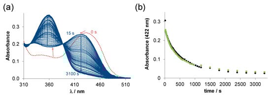Investigation of the redox reaction of these copper(II) complexes with physiological reductants can provide more direct information about their ability to react with reducing agents than solely the values of reduction peak potentials. Therefore, the reaction of the copper(II)-Triapine complex in the presence of HSA (and DAHK) with ascorbic acid and glutathione (GSH) was followed spectrophotometrically under anaerobic conditions. The copper(II)-Triapine complex alone was already studied in one of our previous works [30,34]. Ascorbic acid, which is a weaker reducing agent than GSH, was not able to reduce the copper(II) complex either in the absence or in the presence of HSA. On the contrary, the addition of GSH resulted in significant spectral changes (Figure 9a).