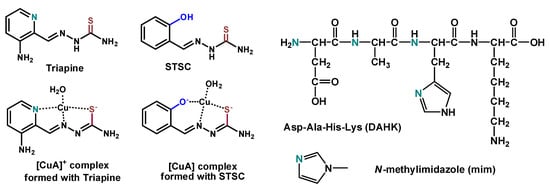 Chemical structures of Triapine, STSC in their neutral forms, and their copper(II) complexes predominating at pH 7.4, and structures of the binding models (DAHK, mim).