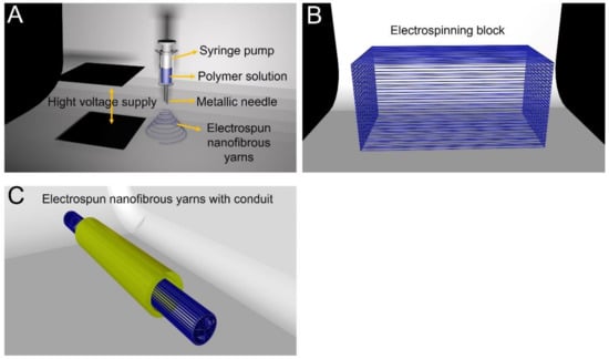 Electrospinning is a multi-purpose and cost-effective process for producing non-woven micro/nanofibers, which can provide an excellent ECM-like environment for tissue and cell growth [57,58]. Electrospun fibers can meet various structural requirements for tissue engineering scaffolds, such as porosity, pores that communicate with each other, adjustable void size, functional filaments, and adjustable morphology [59,60,61]. Electrospinning is a standard method for the preparation of micro-nano fiber [62]. The electric field strength can adjust the diameter of the fiber, mainly by adjusting three parameters in the spinning process: the applied voltage, the defined flow rate, and the distance between the needle and the grounding electrode [63]. The material, shape, and the size of the receiving device, can also change the electric field’s strength and shape, affecting the fiber’s diameter; Figure 1A clearly describes this process. Electrospun micro/nanofilaments can produce a high specific surface area, so that the slow release and diffusion of therapeutic drugs can be achieved through the slow degradation of polymers. The therapeutic drug used in electrospinning, when released, reaches the therapeutic concentration locally and is released continuously; avoiding the damage to other organs that can be caused by systematic administration [64,65]. It is reported that the fiber-containing NGF, can be obtained by electrospinning polycaprolactone and ethyl ethylene copolymer directly, mixed with human β nerve growth factor (NGF) [66]. Due to phase separation, NGF encapsulated in the electrospinning solution is uniformly distributed in the fiber during aggregation. Bioactive NGF can be released in vitro for at least three months, especially when the spun fiber is made to have a unique three-dimensional configuration, as shown in Figure 1B. Some researchers show that, because of their special potential, blends of PHAs may be used in the manufacture of multichannel and electrospun NGCs [67]. From in vivo studies, it was also found that sustained-release could be achieved. Results of the total number of myelinated axons, a cross-sectional area of a regenerated nerve, and the G ratio, confirmed that the directional electrospinning fiber conduit, encapsulated by glial cell line-derived neurotrophic factor (GDNF), could significantly promote the regeneration of rat sciatic nerve [68]. Bovine serum albumin (BSA) was added to the spinning solution of PCL and NGF for electrospinning. The addition of BSA not only increased the total amount of NGF released from the filaments, but also improved the biological activity of the released NGF and promoted the neurite formation of PC12 cells. As shown in Figure 1C, the nerve sleeve made of this electrospinning structure can be compounded with a variety of nutritional factors to promote the growth of axons. Therefore, electrospinning technology has been successfully applied to the preparation of peripheral nerve injury conduits [69].