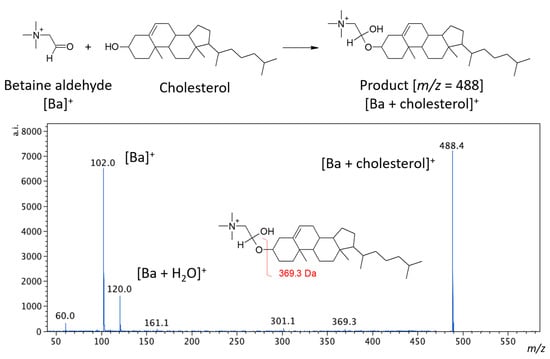 The scheme of cholesterol derivatization reaction with the betaine aldehyde (top) and the MS/MS spectrum for the derivatization product, obtained from the tissue (bottom).