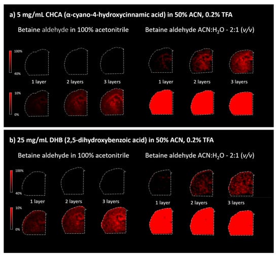 Because betaine aldehyde reacts with alcohols, these solvents cannot be used for its application. Aqueous solutions for mass spectrometry imaging may result in the loss of image resolution. On the other hand, the water addition may help extract the analyte of interest from the tissue. In our case, the application of the betaine aldehyde in 100% ACN resulted in an overall less intensive signal from the derivatization product (m/z = 488.7) (left panels in Figure 3). When betaine aldehyde was dissolved in acetonitrile with water (ACN:H2O; 2:1), an overall higher signal was obtained (right panels in Figure 3).