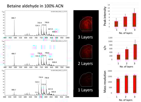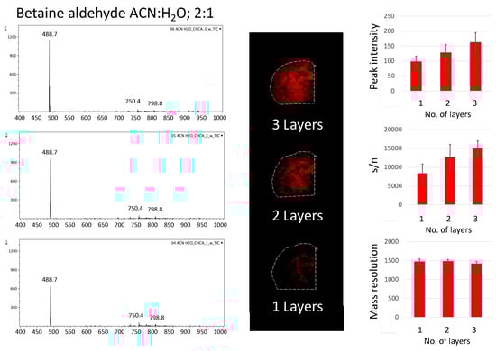 A similar effect could be observed for betaine aldehyde in an acetonitrile/water solution (ACN:H2O; 2:1, v/v), although a slight saturation of the signal’s response with the increasing number of layers could be observed when we considered the intensity from the whole tissue area (see Figure S3, Supplementary Materials). Additionally, in this case, the mass resolution for the monitored peak (m/z = 488.7) decreased somewhat with the number of layers.