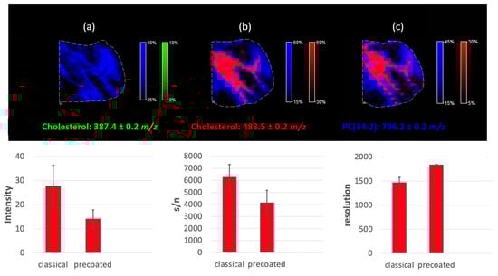 As shown in Figure 7, cholesterol was visible for both approaches (uncoated and precoated glass), as an ion with m/z equals 488.5. PC (34:2) was used here as an endogenous standard and showed that standard lipid analysis is also possible with simultaneous cholesterol detection after each of the proposed strategies. The methodology involving the precoated ITO glasses resulted in a slightly higher spatial resolution of the final image. It is possible that avoiding tissue wetting is the cause. However, the signal from cholesterol is significantly weaker than the signal obtained after spraying the betaine aldehyde solution directly on the tissue. This is likely the result of avoiding the extraction process, which occurs while spraying the betaine aldehyde solution on the tissue. The reduction in ion intensities is more significant than the reduction in the s/n ratio. As a result, the mass resolution obtained for the tissue on a precoated ITO glass is much higher (see Figure 7). As we can see in Figure 7, it was impossible to detect any signal from naive cholesterol (the green color denotes a ratio of 387.4 m/z). The applications of only the CHCA matrix on the tissue (at 369.5 and 385.5 m/z) visible in SIMS were also checked with negative results. While betaine aldehyde retained a positive charge, we tested whether it was possible to obtain a signal from cholesterol after derivatization without CHCA matrix deposition, but for both approaches (the classical and the precoated), the experiments failed.