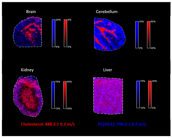 The proposed approach of cholesterol derivatization with betaine aldehyde was tested for different mouse tissues. As illustrated in Figure 8, by using the proposed methodology, cholesterol can be easily analyzed in tissues such as the brain, the cerebellum, the kidneys, and the liver, regardless of whether the tissue is heterogenous (such as the brain) or homogenous (such as the liver). Additionally, lipids analysis was still possible after the derivatization of cholesterol, as we demonstrated on an example of PC (34:2), identified in all analyzed mouse tissues.