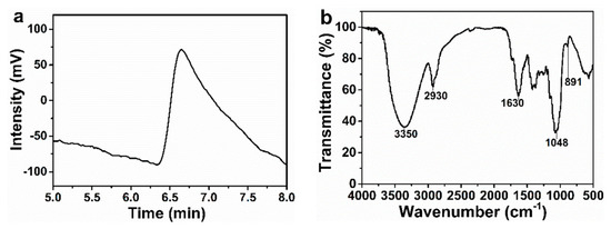 Natural plant polysaccharides are formed by various monosaccharides with glycosidic linkages. Plant polysaccharides also have high molecular weight and various biological activities. GLP is a functional substance obtained from Ganoderma and a potent clinical agent [25]. We used GPC to determine the relative molecular weight of polysaccharides, and the results are shown in Figure 1a. The Mw of GLP was 1.77 × 105 g mol−1, and the Mn was 1.70 × 105 g mol−1. The polydispersity coefficient of GLP was calculated by Mw/Mn = 1.0412, indicating that GLP was a narrowly distributed polydisperse system [26].