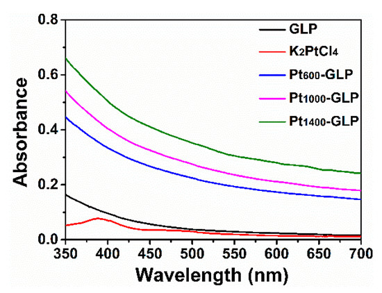 UV-Vis spectra of GLP, K2PtCl4, and Ptn-GLP NCs (n = 600, 1000, and 1400).