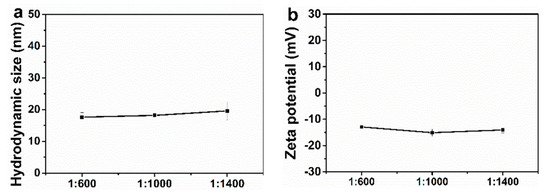 The hydrodynamic size and zeta potential of Ptn-GLP NCs were measured using DLS technology [30]. As shown in Figure 5a, the hydrodynamic size was 17.63 ± 1.45 nm for Pt600-GLP NCs, 18.18 ± 0.03 nm for Pt1000-GLP NCs, and 19.61 ± 2.87 nm for Pt1400-GLP NCs, respectively. The hydrodynamic size of Ptn-GLP NCs included the GLP molecule, which was much bigger than the size of Pt NCs as measured using TEM. Furthermore, the zeta potential of Ptn-GLP NCs was also measured in water. GLP is a chain compound with a triple-helical structure. Figure 5b shows that the zeta potential was −12.93 ± 2.59 mV for Pt600-GLP NCs, −15.1 ± 1.37 mV for Pt1000-GLP NCs, and −14.08 ± 1.15 mV for Pt1400-GLP NCs, respectively. Thus, Ptn-GLP NCs had a hydrodynamic size from 17.6 to 19.6 nm and a slightly negative charge [29].