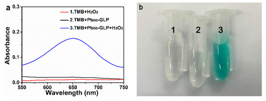 The peroxidase-like activity of Pt600-GLP NCs was studied using TMB as the substrate in the presence of H2O2. As shown in Figure 6a, the TMB + H2O2 + Pt600-GLP NCs group had the maximum absorption peak at 652 nm, and the sample of this group corresponded to a clear blue solution (Figure 6b). Conversely, in the absence of H2O2 or Pt600-GLP NCs, the color of the solution did not change. Therefore, these results demonstrated that Ptn-GLP NCs had peroxidase-like activity. Other noble metal nanoparticles, such as platinum nanoparticles [10] and rhodium nanoparticles [31], have also been reported, exhibiting peroxidase-like activity.