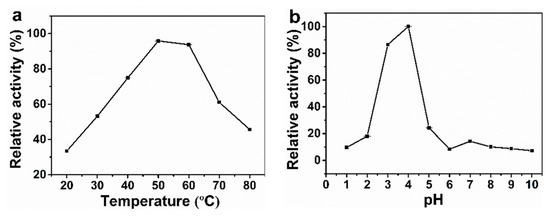 To optimize the reaction conditions, the effects of temperature and pH on the catalytic activity were further investigated. As shown in Figure 7a, the relative catalytic activity of Pt600-GLP NCs reached the highest when the temperature was 50 °C, which was optimal for the reaction. The relative activity of Pt600-GLP NCs between 30 and 70 °C was above 50%. Similarly, Figure 7b showed that the optimal pH for Pt600-GLP NCs was 4.0. The optimal pH was consistent with the optimal activity of nanozymes reported by Wu et al. [32]. The optimum temperature and pH were correlated with the activity of H2O2. The optimal conditions were temperature 50 °C and pH 4.0, which were used for subsequent experiments.