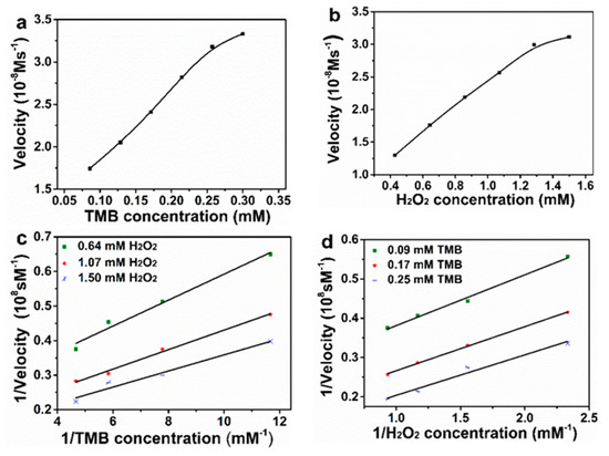 Steady-state kinetic assay and catalytic mechanism of Pt600-GLP NCs: (a) The H2O2 was 1.07 mM with varying TMB concentration. (b) The TMB was 0.17 mM with varying H2O2 concentration. (c,d) Double reciprocal plots of activity of Pt600-GLP NCs with the concentration of one substrate (H2O2 or TMB) fixed and the other varied.
