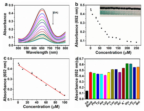 (a) The absorption spectra and (b) absorbance at 652 nm of mixed solutions when Pt600-GLP NCs and TMB systems were added by various concentrations of DA (1–250 μM), (c) linear calibration chart of DA detection, and (d) the absorbance of dopamine (100 μM) and other interfering substances (1200 μM).