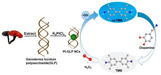 Platinum is an important element in chemical industries. Nanozymes for platinum have been extensively studied because of their enzyme-like activities [13], but their preparation still faces challenges. The preparation usually uses some harmful materials, such as carcinogenic polymer materials [14] and flammable chemical reducing agent NaBH4 [15]. In addition, there are problems in controlling the size and structure of nanozymes [16,17]. Many reported Pt nanomaterials have relatively large particle sizes, which means a small specific surface area and relatively low atom utilization [18,19]. They are thermodynamically unbalanced and tend to aggregate during chemical reactions, resulting in a loss of activity. Consequently, controlling the shape, size and dispersion of nanoparticles is the key factor in achieving high stability and activity. Recently, polysaccharide as a green biomaterial has attracted people’s attention, which is widely used as a carrier material due to its good biocompatibility [10]. Ganoderma lucidum polysaccharide (GLP) is the active component extracted from Ganoderma lucidum, and it is a natural biological macromolecule. It has beneficial physiological functions in immune regulation, anti-tumor, anti-oxidation, hypoglycemia, and regulation of intestinal health, so it has received extensive attention [20,21,22]. The biological activity of GLP is correlated with its composition, three-dimensional structure, and helical conformation [20]. GLP contains β-(1→6)-, β-(1→4)-, and β-(1→3)-D-glucopyranosyl residues in the backbone and sidechains [23]. Moreover, there are many active groups in the structure of GLP, such as hydroxyl and carboxyl, so it can be easily chemically and biochemically modified [20,24]. GLP has high biocompatibility, so it is an ideal material for green preparation of platinum-based nanozymes.