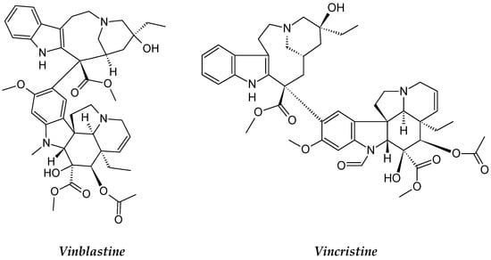 The most potentially active chemical constituents of C. roseus are alkaloids. More than 400 alkaloids were isolated from this plant. Vinca alkaloids vinblastine and vincristine (Figure 2) are the two major active compounds; the two semi-synthetic analogues derived from such active compounds are vinorelbine and vindesine [28,29,30]. Vincristine and vinblastine are the first plant alkaloids to be clinically used as anticancer drugs. Vincristine causes cell death in acute lymphoblastic leukemia cells without significant prior mitotic arrest [31]. Vinblastine mechanistically encourages the minus-end detachment of microtubules from their organizational centers; this generates microtubule fragments [32]. Vinblastine is regularly utilized to treat different types of cancers, including leukemia, breast cancers, small-cell lung cancer, Hodgkin’s and non-Hodgkin’s lymphoma, nephroblastoma, testicular carcinoma, germ cell tumors and Ewing’s sarcoma [30]. Vincristine is used for leukemia in children and its cytotoxicity was examined in vitro in normal peripheral blood mononuclear cells (PBMC) and CLL cells [31,32]. Vincristine is commonly used to cure a variety of carcinomas, such as multiple myeloma, B-cell lymphoma, glioma, metastatic melanoma, negative estrogen-receptor breast cancer, neuroblastoma, colorectal cancer, Hodgkin’s rhabdomyosarcoma, non-Hodgkin’s lymphoma and Wilms’ tumor [32]. The first plant-derived anticancer agents certified by the US FDA were vincristine sulphate (Oncovin®) and vinblastine sulphate (Velban®) in 1963 and 1965, respectively [28]. Vinorelbine and vindesine are used in treating a variety of cancers and can be mixed with other chemotherapeutic agents [28] to treat leukemias, lymphomas, breast and lung cancers, Hodgkin’s lymphoma, advanced testicular cancer, Kaposi’s sarcoma, bladder cancer and brain cancer [32].