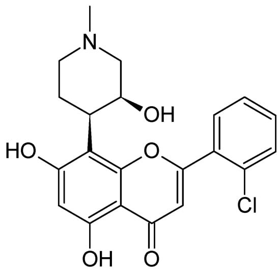Flavopiridol is an alkaloid isolated from the stem bark of Dysoxylum binectariferum. Flavopiridol (Figure 4) has shown potential anti-leukemia effects [42]. Karp et al. [42] studied the anti-leukemia effects of flavopiridol. Their results show that flavopiridol is a broad spectrum cytotoxic drug against acute myeloid leukemia (AML), and its mechanism of action is through the inhibition of cyclin-dependent kinases. Flavopiridol has been used as a potent antiproliferative agent; it showed antitumor activity in clinical studies [43]. Flavopiridol induced apoptosis in bone marrow cells taken from 20 adults patients with refractory acute leukemia in vitro [44,45].