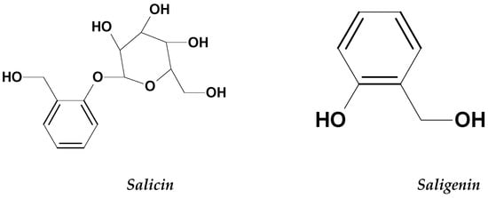 Willows belongs to the Salicaceae family and Salix genus, which contains about 400 species. It is also called osiers and sallows [48] depending on the shape of the leaves. Species with narrower lance-shaped leaves are known as osiers, and those with rounder lance-shaped leaves are known as sallows. Willows are native to cold temperate regions of the Northern Hemisphere. Their leaves and bark have been utilized in treating fevers and as a remedy for pain relief. Its pain relief effect has been studied scientifically, and the bioactive compound salicin (Figure 5) was found to be responsible for it [49,50].