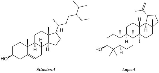 B. alba contains various bioactive phytoconstituents with proven cytotoxic, antioxidant, hemagglutinating and antiproliferative effects on cancer cells [69]. The B. alba leaf and seed extracts have different phytoconstituents, such as phenols, flavonoids, saponins, alkaloids, tannins, steroids and phytosterols [70]. The plant also has many important phytochemicals, including betacyanins, carotenoids, triterpene oligoglycosides, various organic acids, basellasapoins A–D, kaempferol and betalin [71]. A different study showed that the methanolic plant extract contained β-sitosterol and lupeol (Figure 8), which were found to be cytotoxic to lung cancer cells and leukemia cells [72]. The methanolic leaf extract of B. alba displayed significant growth inhibition of U937 leukemic cells in a dose-dependent manner [73].
