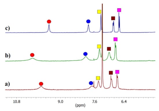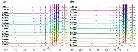 With receptors 1–4 in hand, we investigated their anion and ion pair binding ability using 1H NMR titration method in deuterated DMSO. Dilution experiments indicated that self-association does not occur in the investigated concentration range (2.3 × 10−3 to 3 × 10−4 M) (see Supplementary Materials). On the other hand, test experiments with tetrabutylammonium hexafluorophosphate or perchlorate, confirmed that receptors did not interact with TBA+, PF6− or ClO4− since addition of these salts to the solution of receptors in DMSO do not affect their spectra. Initially we selected interaction with chloride salt to screen the binding abilities of receptors 1–4 and to validate the design principles of the preorganization of anion and cation binding domains on each arm of the tripodal platform. For this purpose, titration with tetrabutylammonium chloride (TBACl) was used as an anion source, and in the case of sodium or potassium chloride recognition the assistance of sodium perchlorate or potassium hexafluorophosphate was assured (3 equiv. for receptors 1–3 and 1 equiv. for receptor 4). The association constants, calculated by nonlinear regression analyses of the binding isotherms, are presented in Table 1.