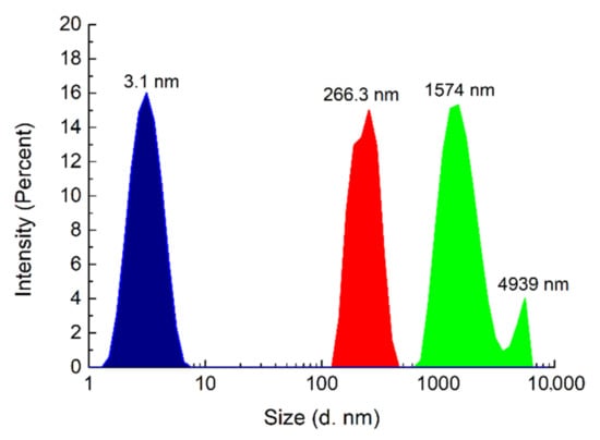 Distribution of the hydrodynamic diameter: 1 mM 2 in wet CHCl3 (green), after extraction of 50 mM K2SO4 (red), after extraction of 50 mM KCl (blue).