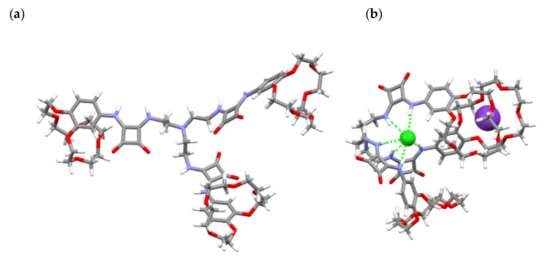 Minimized structures (DFT, B3LYP/6-31G*, Spartan’10, Wavefunction®) of receptor 2 (a) and complex of receptor 2 with KCl (b).
