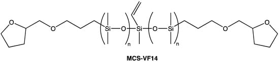 | MCS-VF14 | monoVINYL FUNCTIONAL POLYDIMETHYLSILOXANE, TETRAHYDROFURFURYLOXYPROPYL TERMINATED—symmetric | 1000–1200 | 30–40 | 0.976 | 1.4141 | [61,79,87,112] |