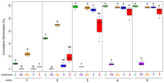 Cumulative germination percentage during five weeks of Physalis peruviana seeds subjected to different pre-germination treatments. C: Control (seeds without treatment, green boxes); CS: Commercial (seeds purchased from a local seller, purple boxes); WA: Wood ash (seeds after seven-day storage with wood ash, orange boxes); F: Fermentation (seeds removed after seven-day storage with pulp fruit, blue boxes); S: NaCl (a 60 mM NaCl solution supplied to the seeds three times per week, red boxes). Data expressed as median and interquartile range (n = 3). Different letters over each box indicate significant differences for each %CG according to the post-hoc Tukey test (p < 0.05).
