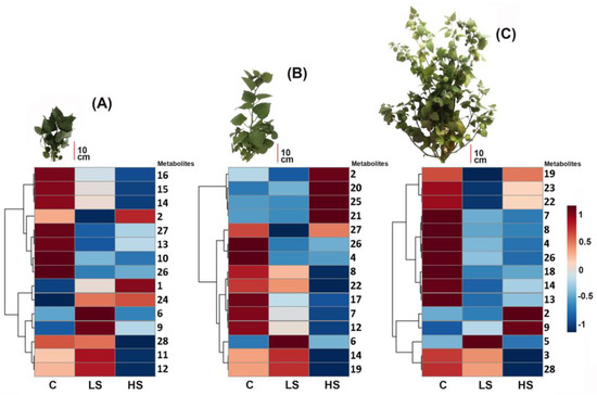 After pre-treatment of raw LC-MS-derived profiles, the peak area of each feature (i.e., metabolite at a retention time) versus observations (i.e., treated plants per substage (n = 9) and their replicates (n = 12)) were compiled. The resulting metabolic data matrix (feature × observations = 1213 × 108) was initially filtered by the variable influence on projection (VIP) scores after partial least squares discriminant analysis (PLS-DA) over the entire normalized data set. This first classification was performed to explore the distribution of the relative abundance of detected features and select the relevant information from metabolic profiles by the examination of the most contrasting patterns. Hence, the differential comparison of the VIP scores of each feature between salinized conditions led to gather the fifteen most contrasting features per growth substage, based on VIP > 1. Some of these contrasting features were common among growth substages, but other features were exclusively selected for a particular substage. Therefore, for the three test substages, a set of twenty-eight features were statistically selected (fifteen per substage). Such features (1–28) were annotated at level 3 using their spectral data, which are listed in Table A2. The resulting contrasting patterns were intuitively visualized through heat maps, whose each color cell is associated with a relative abundance of each metabolite to compare salt treatments per substage (Figure 2). These heat maps showed that salt treatment impacted metabolic profiles since important differences (i.e., downregulated and upregulated metabolites) between control and salinized groups were observed. This trend was clearly evidenced by the clustering analysis among these most contrasting features, since two main clusters were observed for all growth substages, comprising downregulated metabolites (i.e., most-abundant metabolites in the control group) as the first cluster and upregulated metabolites by the effect of HS and LC treatments as the second one (Figure 2).