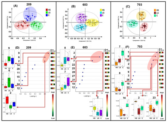 Comparative analysis of the LC-MS data of aerial part-derived extracts from those P. peruviana plants collected at different growth substages (209, 603, and 703) under different salt treatments (HS: high salinity (90 mM NaCl); LS: low salinity (30 mM NaCl); C: Control (without NaCl treatment)) by means of sparse partial least squares discriminant analysis (sPLS-DA) to establish the metabolic differences (R2 > 0.85; Q2 > 0.78). Scores plot supervised by salt treatment: HS: red; LS: green; C: blue for the dataset from plants at the substages (A) 209, (B) 603, and (C) 703. Loadings plot ranking the most-influencing metabolites to discriminate treatments for the dataset from plants at the substages (D) 209, (E) 603, and (F) 703. Metabolites are numbered according to the annotated metabolite list presented in Table A2. The highly top-ranked metabolites per growth substage are highlighted in red ellipses.