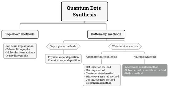 The relevance of these methodologies remains due to the advantages that are presented such as the high %QY, the lower cost of equipment compared to the top-down methods, rapidness of the reactions, the lower size of QDs achieved (few nanometers vs. 30 nm in top-down methods), and that they can be employed in biomedical applications and analytical detections. Unfortunately, the disadvantages of these methodologies are the temperature requirements (up to 250 °C) and the presence of solvent residues [11].