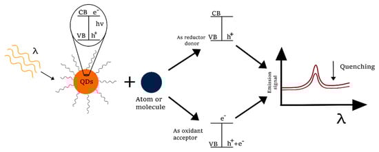Although traps on the QDs’ surface affects considerably the photoluminescence of QDs, some strategies of analysis exploit this characteristic. Anions and cations on the surface are vacancies that can be bonded to specific molecules, eliminating the trap sites and passivating the QDs’ surface, resulting in an enhancement of the emission signal (Figure 7) [78].