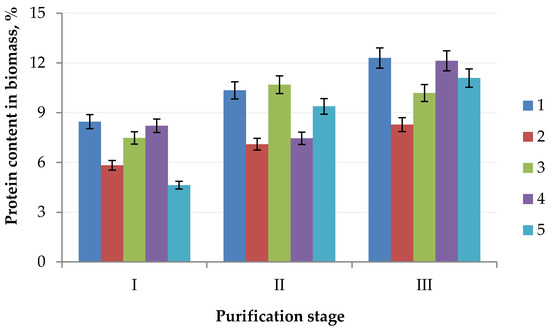 Change of the protein content in the algae biomass: (1) Chlorella vulgaris; (2) Arthrospira platensis; (3) Nostoc sp.; (4) Dunaliella salina; (5) Pleurochrysis carterae) in the purification process (stage I, extraction; stage II, ultrafiltration; stage III, HPLC).
