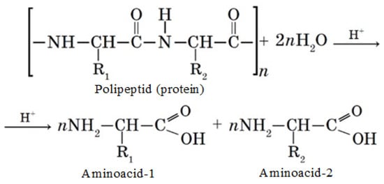 To study the amino acid composition of proteins, a method was used based on the decomposition of the objects of study under the action of acids (concentrated hydrochloric and sulfuric acids) and inorganic alkali into free forms of amino acids, their further separation, and quantitative determination of the latter on a capillary electrophoresis system Capel-105/105M (Lumex, St. Petersburg, Russia) using the M-04-38-2009 technique, which is based on the extraction of acids from the test sample with distilled water, separation, and quantitative determination of components by capillary electrophoresis with indirect detection at a wavelength of 190 nm [27]. An L-amino acids kit LAA-21 by Lumex (Lumex, St. Petersburg, Russia) was used as standard samples. The protein hydrolysis process in the presence of acid (H+) is shown in Scheme 1.
