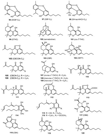 A total of thirty miscellaneous type cannabinoids (Figure 7 and Figure 8) have been isolated from cannabis, including dehydrocannabifuran (DCBF-C5, 96), cannabifuran (CBF-C5, 97), 8-hydroxy-isohexahydrocannabivirin (OH-iso-HHCV-C3, 98), 10-oxo-Δ6a(10a)-tetrahydro-cannabinol (OTHC, 99), cannabicitran (100), (–)-Δ9-cis-(6aS,10aR)-tetrahydro-cannabinol (cis-Δ9-THC, 101), cannabicoumaronone (CBCON-C5, 102), cannabiripsol (CBR, 103), cannabitetrol (CBTT, 104), cannabichromanone-C5 (CBCN-C5, 105), cannabichromanone-C3 (CBCN-C3, 106),(±)-Δ7-cis-isotetrahydrocannabivarin-C3 (cis-iso-Δ7-THCV,107), (–)-Δ7-trans-(1R,3R,6R)-isotetrahydrocannabi- varin-C3 (trans-iso-Δ7-THCV,108), and (–)-Δ7-trans-(1R,3R,6R)-isotetrahydrocannabinol-C5 (trans-iso-Δ7-THC, 109). The cyclohexane-methanol extract of Afghan hashish afforded dehydrocannabifuran (DCBF-C5, 96), cannabifuran (CBF-C5, 97), OTHC (99), and cannabichromanone-C5 (CBCN-C5, 105) after micropreparative GC and TLC. Their chemical structures were determined by mass and NMR spectroscopic analysis []. Cannabicitran (CBT, 104) was isolated from an ethanolic extract of Lebanese hashish. It was purified by counter-current distribution and silica gel chromatography. Its chemical structure was determined by GCMS, IR and 1H NMR analyses []. The isolation of cis-Δ9-THC (101) was reported from a petroleum extract of marihuana by Smith and Kampfert in 1977. The extract was purified on a florsil column followed by preparative TLC [].