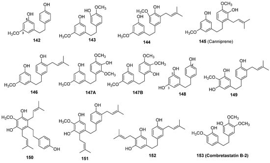 Twelve dihydrostilbenes (142–153) were isolated and identified from C. sativa (Figure 10). Turner et al. reported four new dihydrostilbenes in his review []. These compounds are 3-[2-(4-hydroxyphenyl)-ethyl]-5-methoxyphenol (142), 3-[2-(3-hydroxy-4-methoxyphenyl)-ethyl]-5-methoxyphenol (143), 3-[2-(3-isoprenyl-4-hydroxy-5-methoxy-phenyl)-ethyl]-5-methoxyphenol (144) and canniprene (145). Their chemical structures were determined by chemical and spectral analysis, while the chemical structure of 145 was confirmed by synthesis []. Two dihydrostilbenes, named cannabistilbene I (146) and cannabistibene II (147), were isolated from the polar acidic fraction of a Panamanian variant of C. sativa grown at the University of Mississippi. The chemical structure of cannabistilbene I (146) was elucidated as 3,4′-dihydroxy-5-methoxy-3′(3-methylbut-2-enyl)-dihydrostilbene by 1H NMR and mass spectral analysis and confirmed by total synthesis. The chemical structure of cannabistilbene II (147) was proposed as either 147A or 147B based on spectral analysis []. El-Feraly isolated 3,4′,5-trihydroxy-dihydrostilbene (148) from the ethanol extract of a hashish sample. The chemical structure of 148 and its prepared triacetate were established by 1H and 13C NMR spectroscopic analysis as well as total synthesis []. Recently, Guo et al. isolated three new prenylated stilbenes (149–151) and two other known stilbenes (152–153) from the leaves of C. sativa grown in Yunnan Province, China. The authors applied multiple chromatographic techniques in the isolation and purification of compounds 149–153, such as column chromatography over silica gel cc, ODS C18 Si gel column chromatography, Sephadex column chromatography, and preparative HPLC. Spectral techniques such as 1D and 2D NMR spectroscopy and HRESIMS were used to determine the chemical structures as α,α′-dihydro-3′,4,5′-trihydroxy-4′-methoxy-3-isopentenylstilbene (149), α,α′-dihydro-3,4′,5-trihydroxy-4-methoxy-2,6-diisopentenylstilbene (150), and α,α′-dihydro-3′,4,5′-trihydroxy-4′-methoxy-2′,3-diisopentenylstilbene (151), α,α′-dihydro-3,4′,5-trihydroxy-4,5′-diisopentenylstilbene (152) and combretastatin B-2 (153) [].