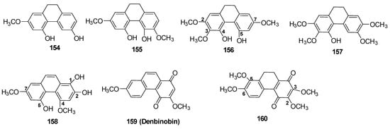 Two dihydrophenenathrens, cannabidihydrophenanthrene (cannithrene 1) (154) and cannithrene 2 (155), were isolated from Thailand cannabis [,]. The chemical structure of cannithrene 2 was confirmed by X-ray crystallography of its diacetate derivative. The authors proposed that cannabidihydrophenanthrene (154) was biogenetically derived from cannabispiradienone (129) via a diene-phenol rearrangement []. Two dihydrophenanthrenes (156–157) and one phenethrene derivative (158) were isolated from an ethanolic extract of a high potency cannabis variety grown in Mississippi using a combination of normal and reversed phase chromatographic techniques and were identified as 4,5-dihydroxy-2,3,7-trimethoxy-9,10-dihydrophenanthrene (156), 4-hydroxy-2,3,6,7-tetramethoxy-9,10-dihydrophenanthrene (157) and 4,7-dimethoxy-1,2,5-trihydroxyphenanthrene (158) []. In 2008, Sanchez-Duffhues isolated the known 1,4-phenanthrenequinone, denbinobin (159) from an acetone extract of C. sativa chemotype (CARMA) after fractionation and column chromatography. Denbinobin (159) was purified by crystallization from ether []. Another 1,4-phenanthrenequinone derivative was also isolated from the leaves and branches of C. sativa, its chemical structure was determined as 2,3,5,6-tetramethoxy 9,10-dihydrophenanthrenedione (160) using 1D and 2D NMR as well as ESI-MS []. The chemical structures of the reported dihydrophenathrenes and phenanthrenes are presented in Figure 11.
