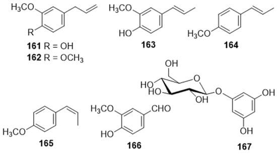 Five simple phenols (161–167) were detected in the essential oil of Cannabis (Figure 12) and identified by GC/MS as eugenol (161), methyleugenol (162), iso-eugenol (163), trans-anethol (164) and cis-anethol (165) [,]. Vanillin (166) was isolated and identified from hemp pectin using silica gel column chromatography and identified via 1H NMR, 13C NMR, and ESI-MS spectroscopic methods []. Phloroglucinol β-D-glucoside (167) was identified from the stem exudate of greenhouse-grown C. sativa by TLC, but its aglycone (phloroglucinol) was isolated after acid hydrolysis of the exudate. Phloroglucinol was identified by 1H NMR and GC/MS experiments [].